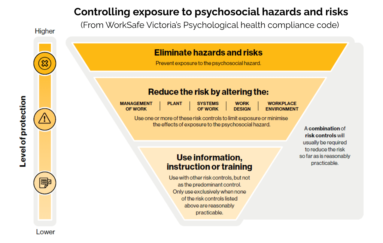 Employers must identify, assess, and control psychosocial hazards, so far as is reasonably practicable. This includes applying a hierarchy of control, prioritising: